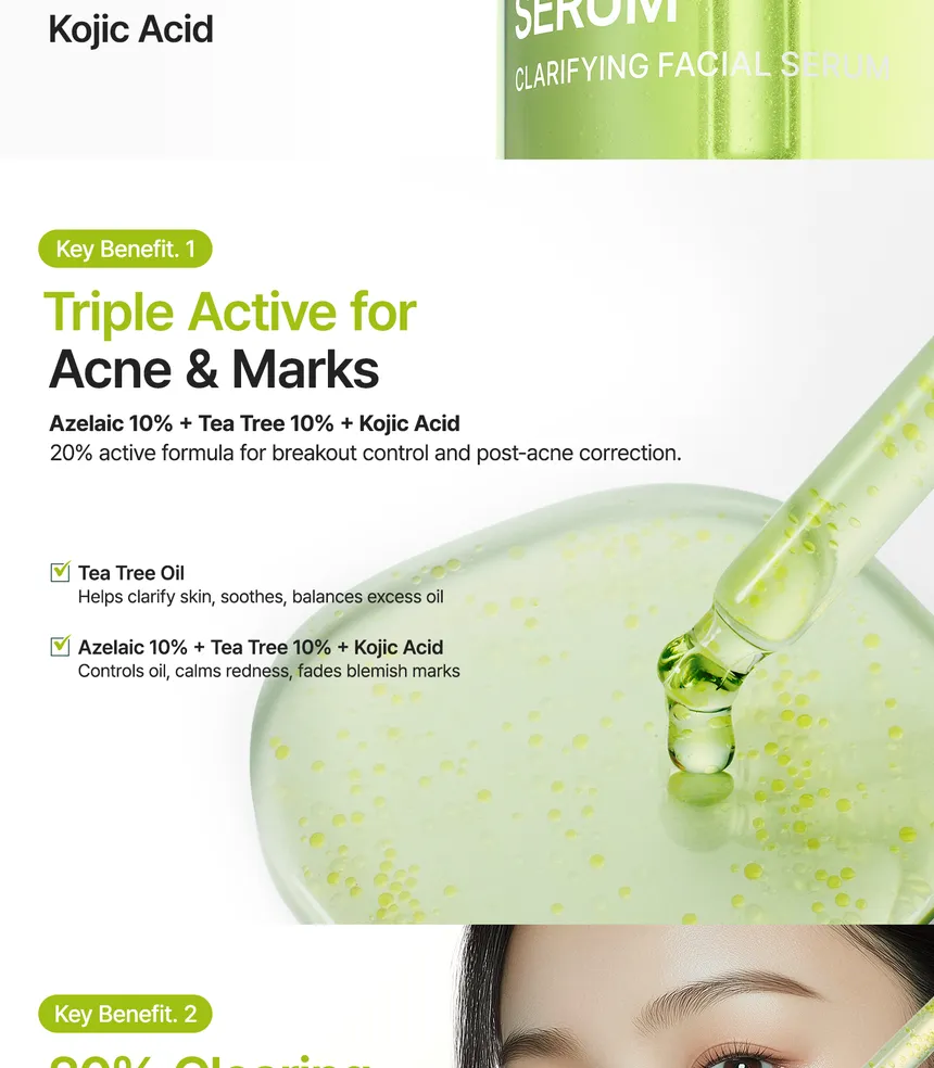 Azelaic Acid 10 Kojic Tea Tree Serum—the name itself speaks to a powerful, multi-active solution for challenging skin. This incredible clarifying facial serum is your go-to product for instant relief and long-term correction of blemishes, excess oil, and stubborn post-acne marks.