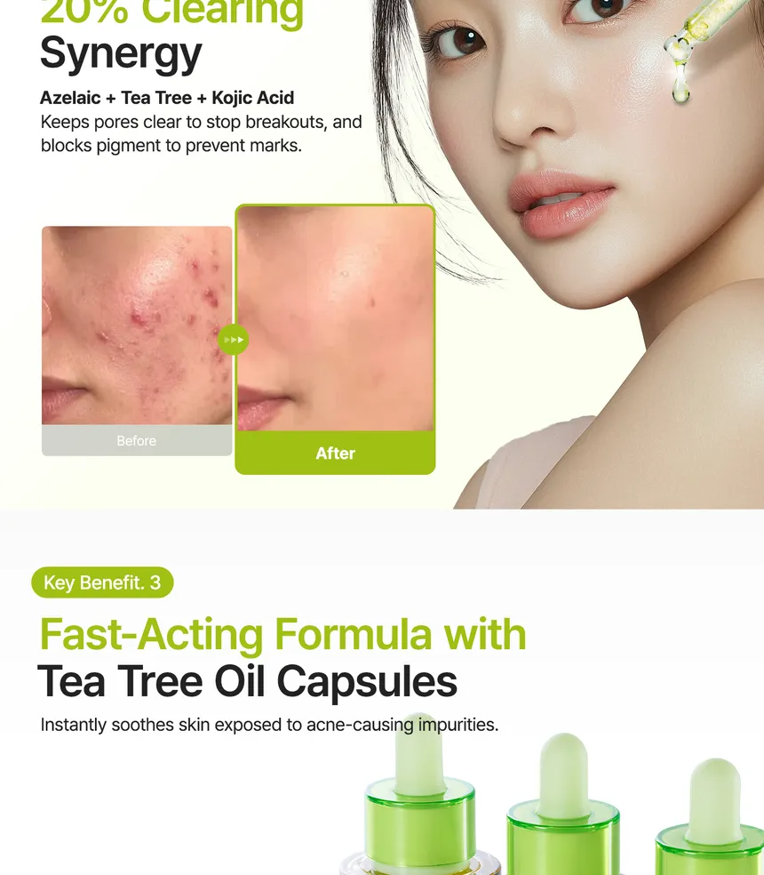 The serum features a high concentration of $10\%$ azelaic acid—a powerhouse ingredient that works wonders for acne-prone skin. It gently exfoliates, unclogs pores, and possesses antibacterial properties to fight acne-causing impurities. Complementing this, encapsulated tea tree oil microcapsules instantly deliver a powerful soothing effect to calm redness and visible inflammation right on contact. This duo helps to significantly reduce active breakouts and control excess sebum production for a matte-yet-hydrated finish.