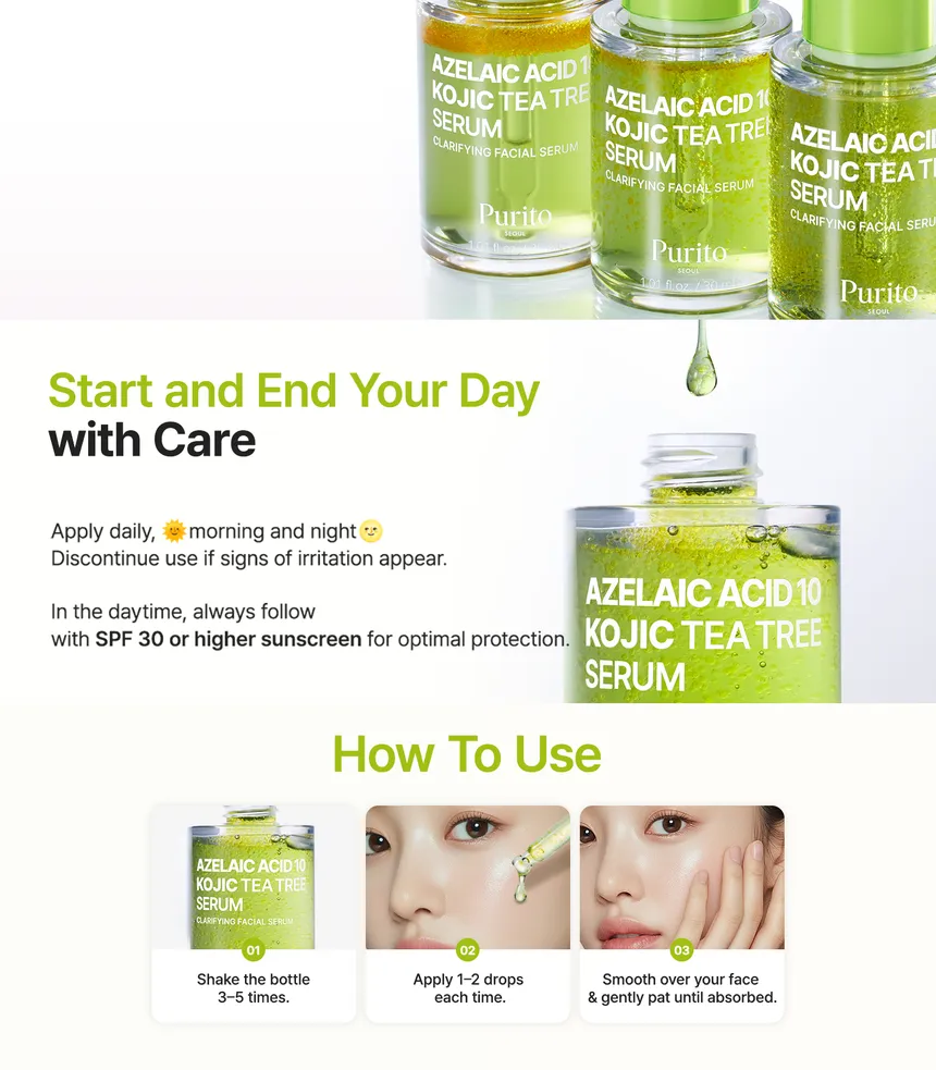 Apply: Apply 1-2 drops of the Azelaic Acid 10 Kojic Tea Tree Serum to your entire face, or specifically target areas of concern.